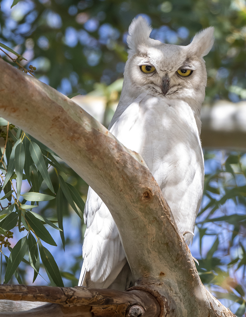 Leucistic Great Horned Owl. I photographed this unusual owl in the Catalina Foothills in Tucson. Leucism is a condition in which there is partial loss of pigmentation in an animal resulting in white, pale, or patchy coloration of the skin, hair, feathers, scales or cuticle, but not the eyes. Unlike albinism, it is caused by a reduction in multiple types of pigment, not just melanin.