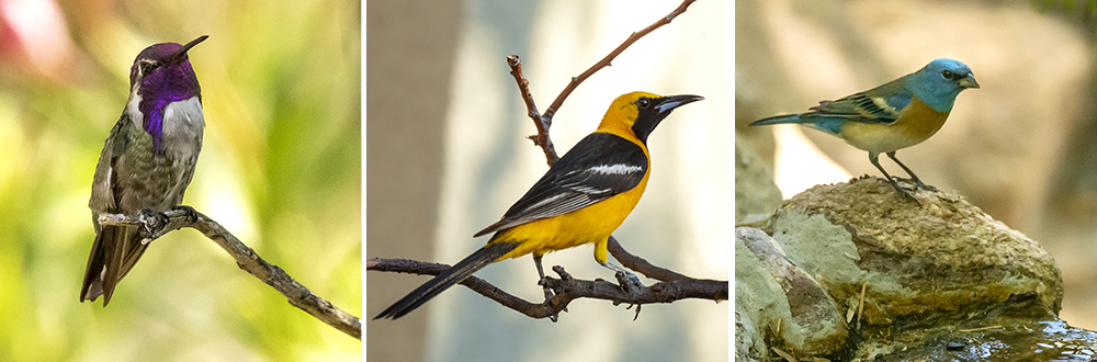 Photos below: Costa's Hummingbird, Hooded Oriole, Lazuli Bunting